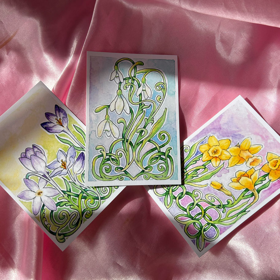 A set of three A7 watercolour art prints featuring three spring flowers, crocus, daffodils and snowdrops. These botanical art prints are inspired by Celtic knots and my favourite season. These small art prints are perfect to stick in journals or hung up on walls as a mini gallery!