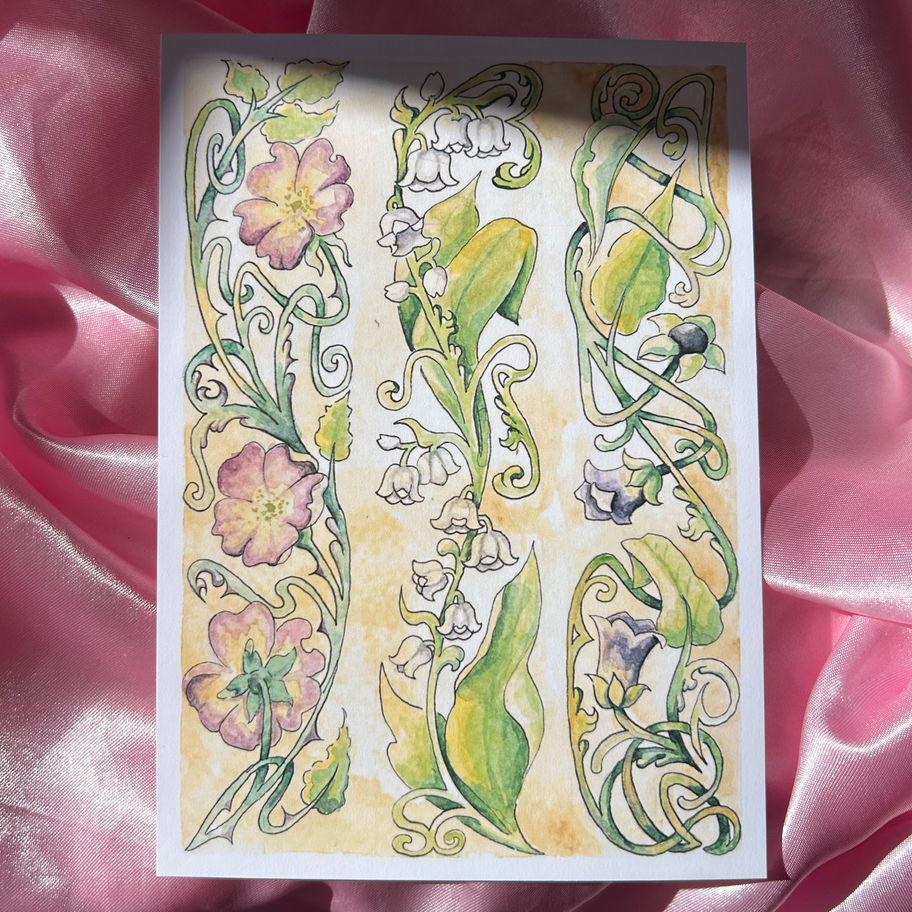 A sweet A6 print with three botanical pillars, each painted in watercolour on a coffee background. This piece has dog rose, lily of the valleys, and deadly nightshade. This whole collection is dedicated to those who love more muted and deeper tones and flowers with mysterious and darker symbolism.