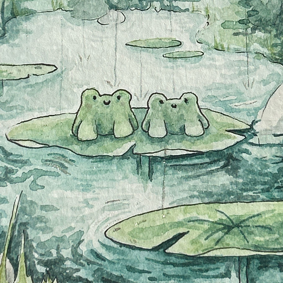 Two lil frog friends enjoying the weather while they sit on a watercolour lily pad. I loved painting this mini piece, and I also loved painting the rain and the ripples. If you would like to add extra magic to your print, choose 'add sparkles' and I'l hand paint glitter rain onto your print.