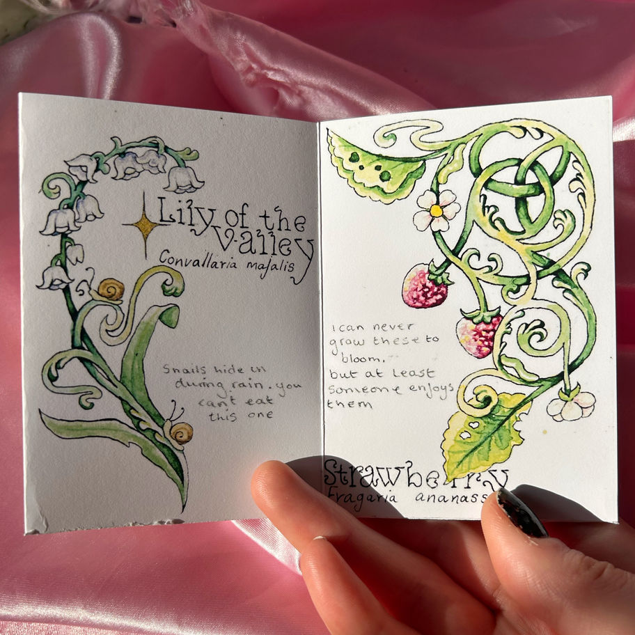 This A4 zine features six botanical paintings, each paired with its own garden critter, alongside the common name, scientific name, and a small handwritten field note. I wanted this edition to feel like it once belonged to a fairy and has now been gently passed on to you.