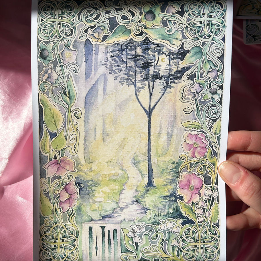 Step into a moonlit glade where hellebores, lily of the valley, and nightshade flowers form a delicate border around a gently flowing river. I loved experimenting with illuminated borders again, and working with coffee. This watercolour print is where I imagine fairies sleep, and is perfect for those who love darker whimsical scenes and magic wall decor.
