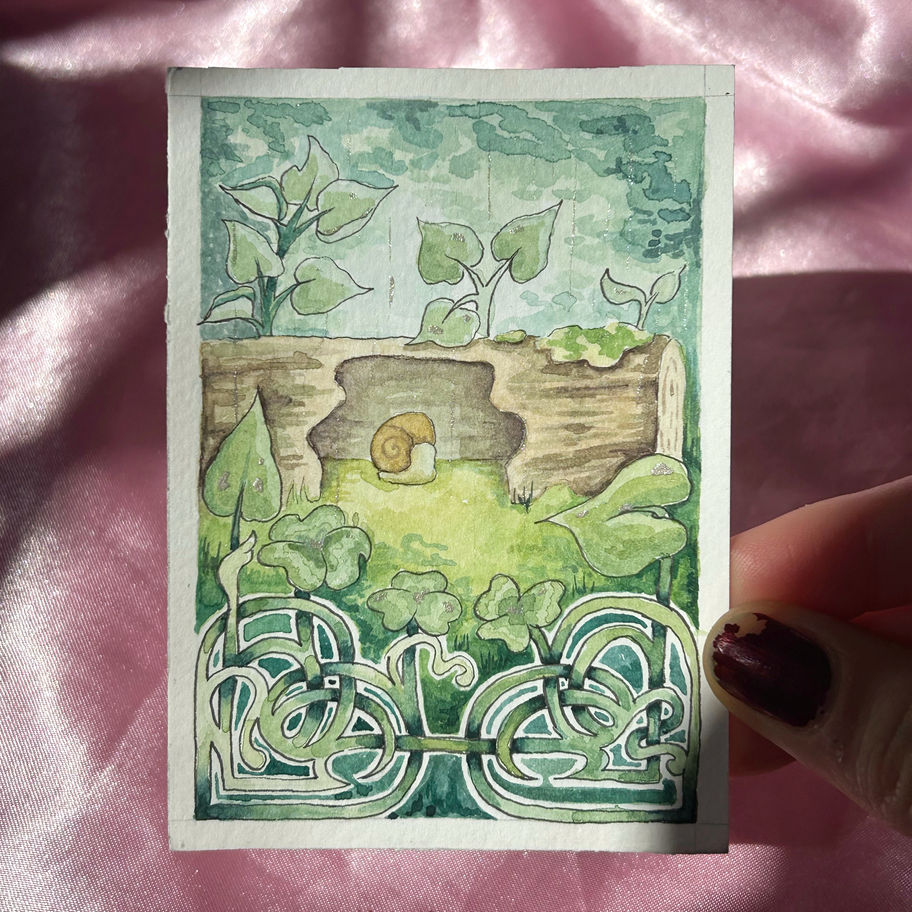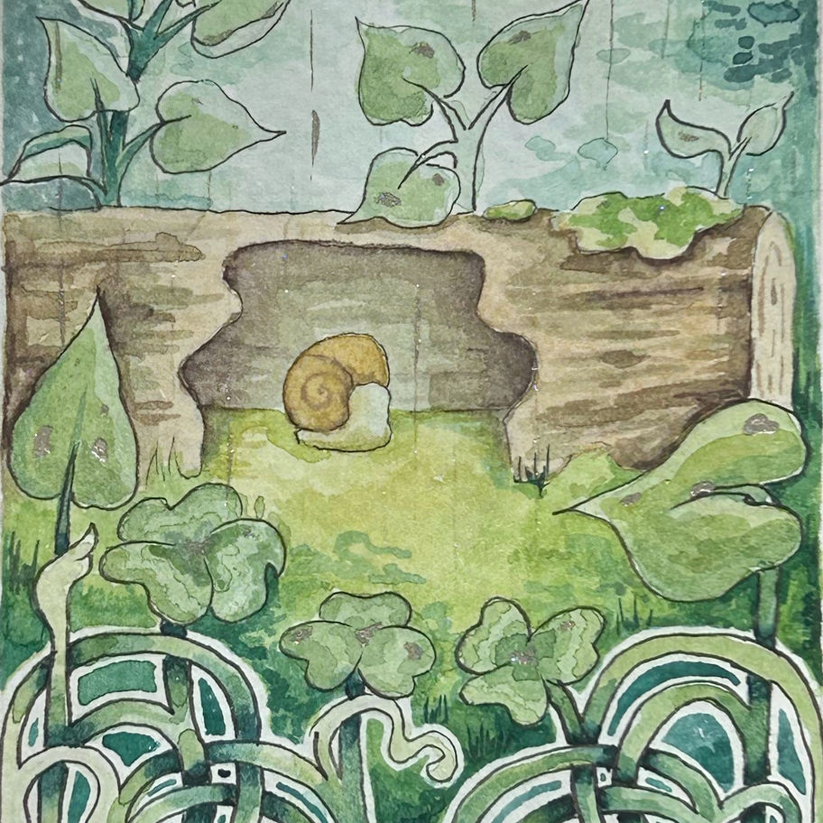 A small watercolour art print with a lil' snail hiding from the rain. He has made a home in a carved out log, as silver sparkly rain surrounds him. If you choose to add sparkles to your print, I'll hand paint the rain droplets making this print extra whimsical!